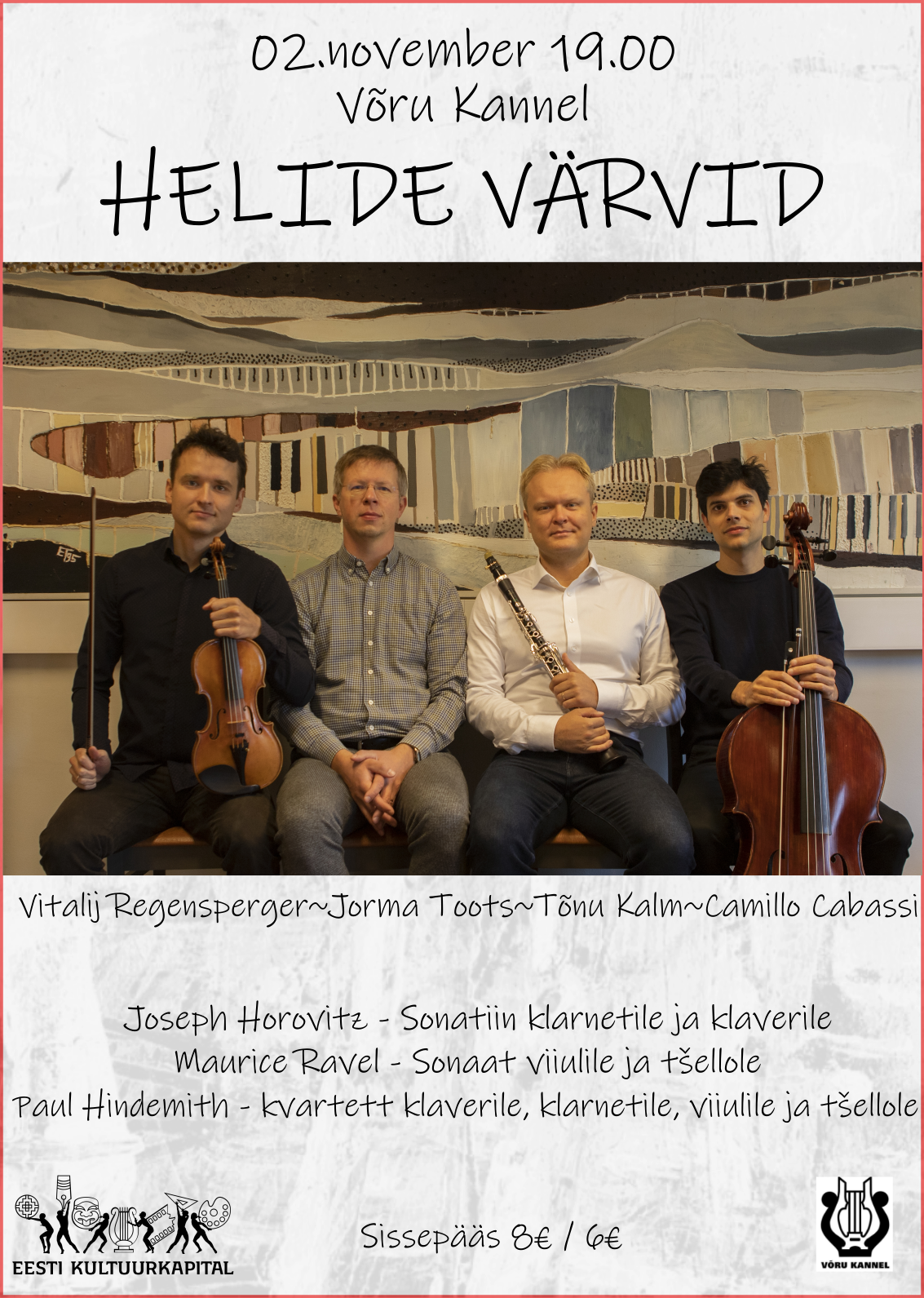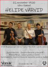 | Ürituse nimi: | Kontsert "HELIDE VÄRVID" - Tõnu Kalm (klarnet), Vitalij Regensperger (viiul), Jorma Toots (klaver), Camillo Cabassi (tšello) |