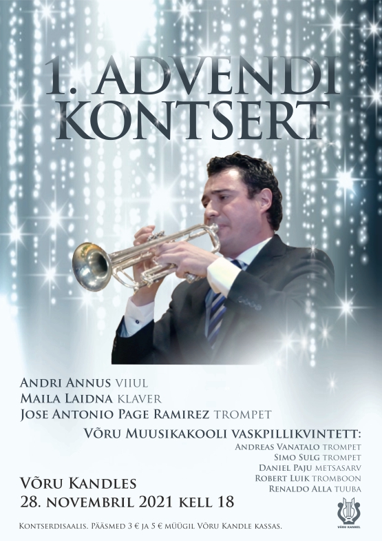 | Ürituse nimi: | 1. ADVENDI KONTSERT. Andri Annus (viiul), Maila Laidna (klaver), Jose Antonio Page Ramirez (trompet) ja Võru Muusikakooli vaskpillikvintett |